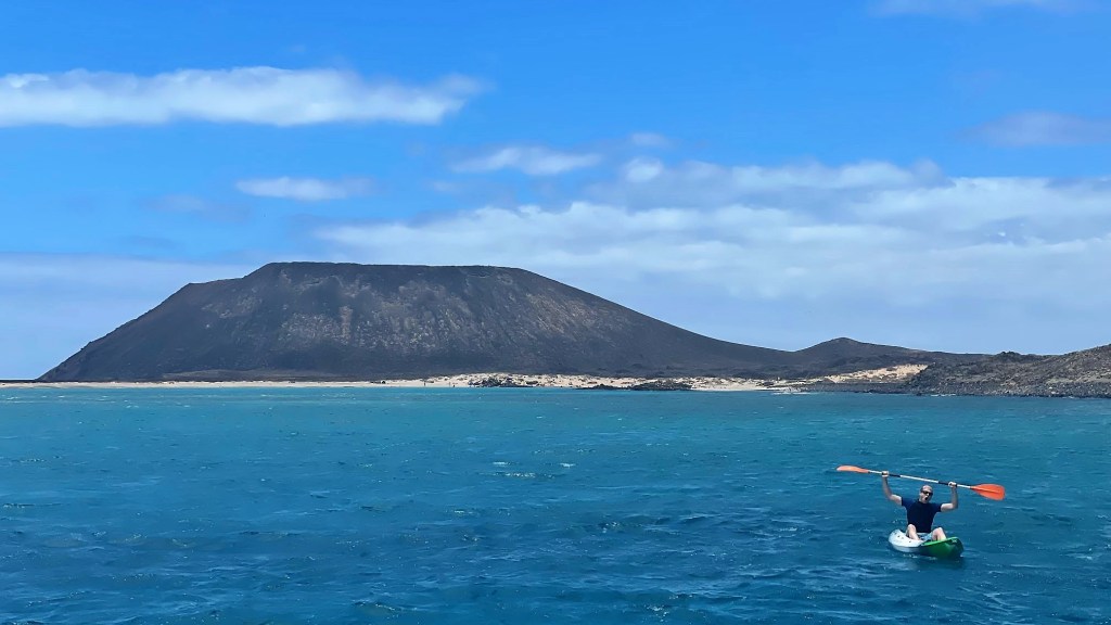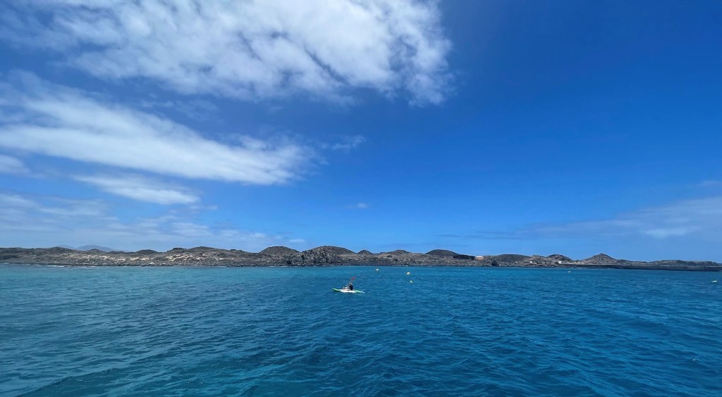 On the way over from Corralejo, I had been eyeing Lobos. When I discovered that we had a kayak, I decided that I wanted to make landfall and to claim the island as my own. Unfortunately, our captain had made clear to us that we were not allowed to visit the island. Apparently, there were some safety concerns, as landlubbers had hurt themselves trying to make it to shore. But the island was right there. I wanted to set foot on it. Friendly negotiations commenced. In the end, we cut a deal, where I could paddle to the island, hop out, and hop right back in the water. I set off before anyone could change the plan.