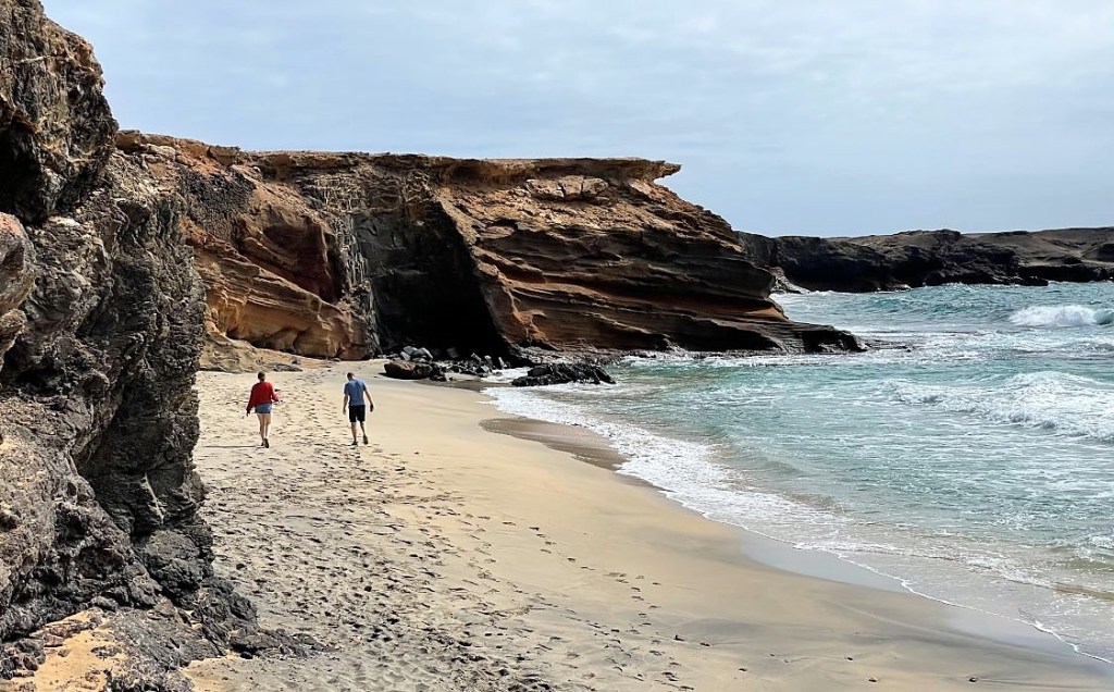 As we drove, we saw some smaller roads heading south towards the water. We turned down one of these roads, parked the car, and wandered down to the beach in an area near La Playa de Las Pilas. Julie was particularly excited to see how calm the water was on this southern side of the island, compared to the crashing waves on the western side near Cofete. We spent some time wandering around the shore to the sound of gentle waves.