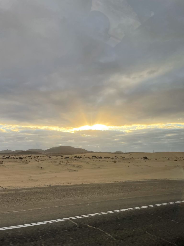 We waded in the water to cool our feet, but soon it was time to go. It was already 6 pm, and the drive back to Corralejo would take us more than two hours. We soon made it back to the paved roads and headed north. We chatted and listened to music as we drove, with the sun setting over Fuerteventura.