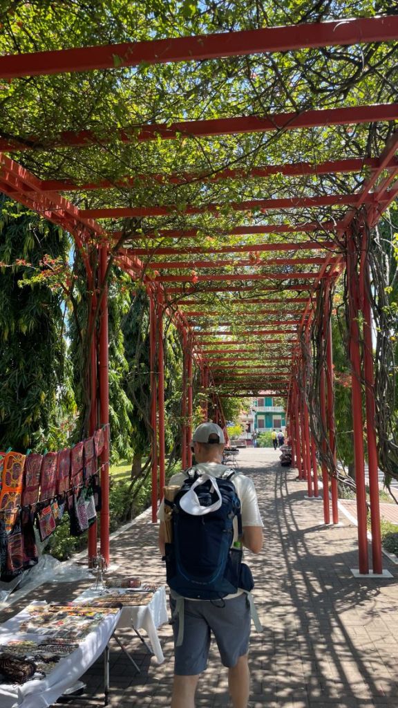 Our walk took us through the Plaza V Centenario, which I think is a square that commemorates the 500th year anniversary of the founding of Panamá. To get out of the sun, we passed through a large arbor where local craftspeople sold their creations.