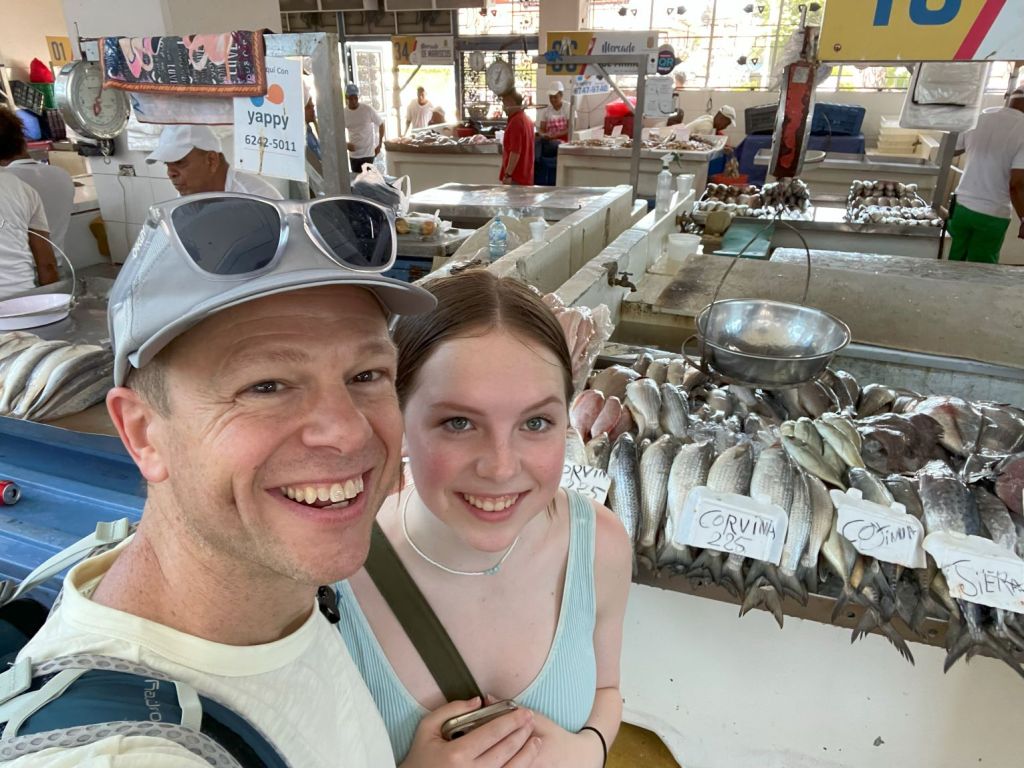The facade originally was in Panamá Viejo. After that original settlement burned and Panamá relocated to Casco Antiguo, the facade was moved, stone by stone, to this location. As a result, the facade was erected in 1680, just seven years after the founding of Casco Antiguo. By this time, the tropical sun was flexing its muscle, so Team Hubbard stopped for smoothies at Ola Frappe, a nearby coffee shop. While we waited in the air-conditioned shop for our smoothies, we decided to extend our walking tour beyond Casco Antiguo to visit the local fish market. Armed with cold drinks, we set out.