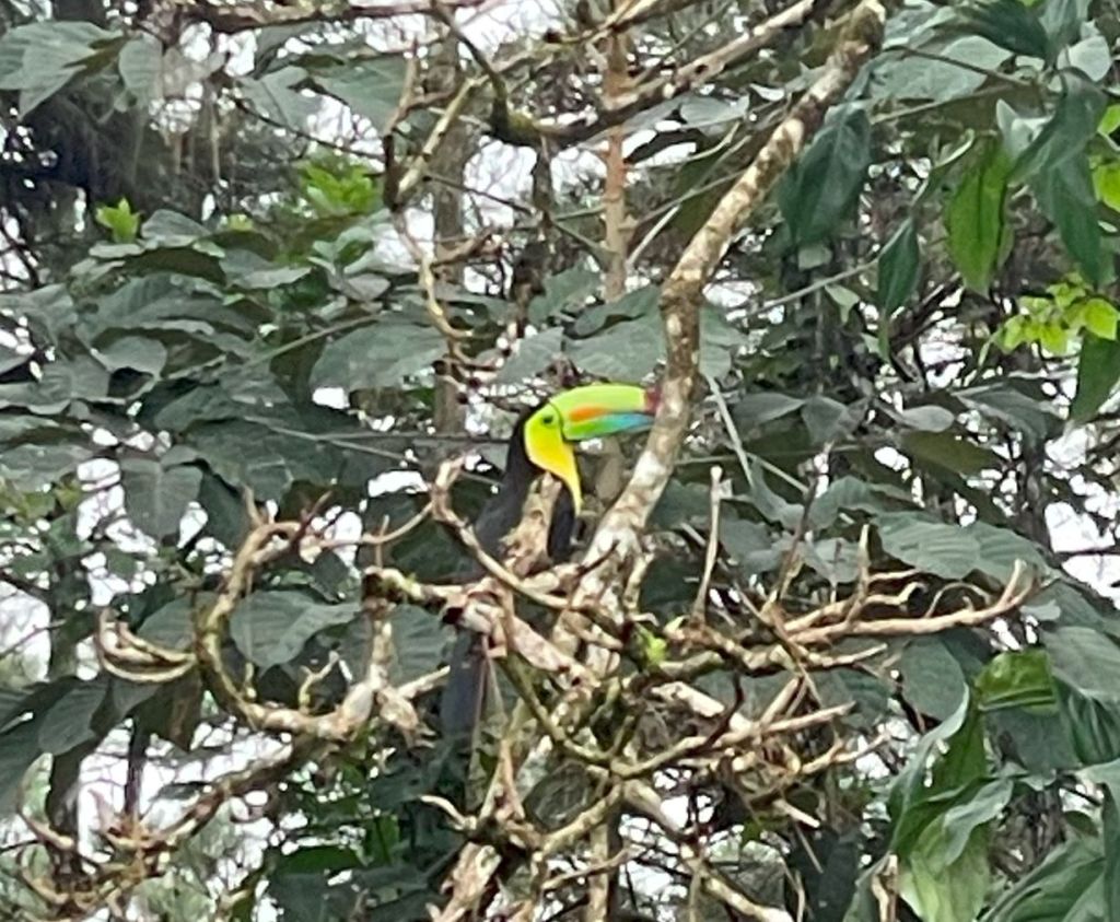 The roads were paved but small, steep, and twisty. When we passed through small villages, there were frequently dogs sunning themselves on the road. We often passed through dense jungle. As we neared Pozo Azul we were excited to spot a toucan sitting on nearby tree.