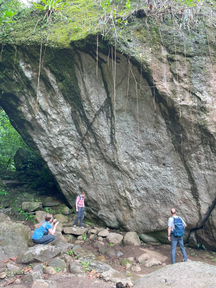 Early in the hike, the trail passes by La Piedra Pintada (“the painted rock”), a huge boulder with pre-Columbian carvings. Locals have filled in some of the carvings with chalk to make them easier to see, but the meanings of the carvings are unclear.