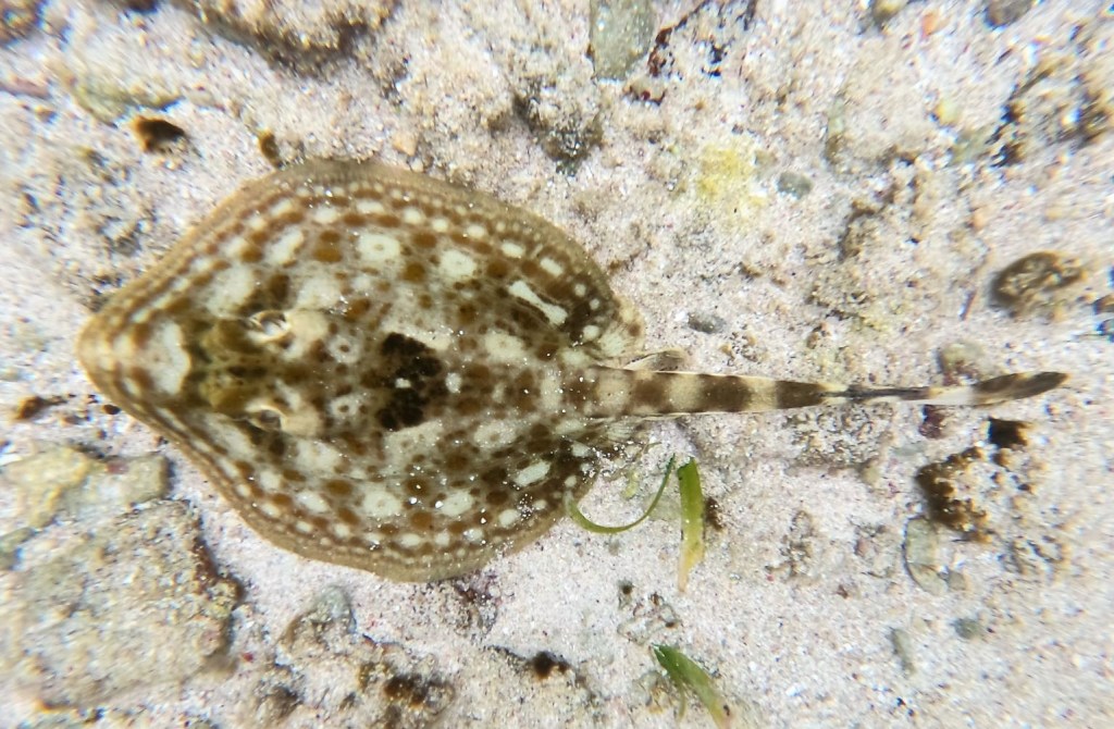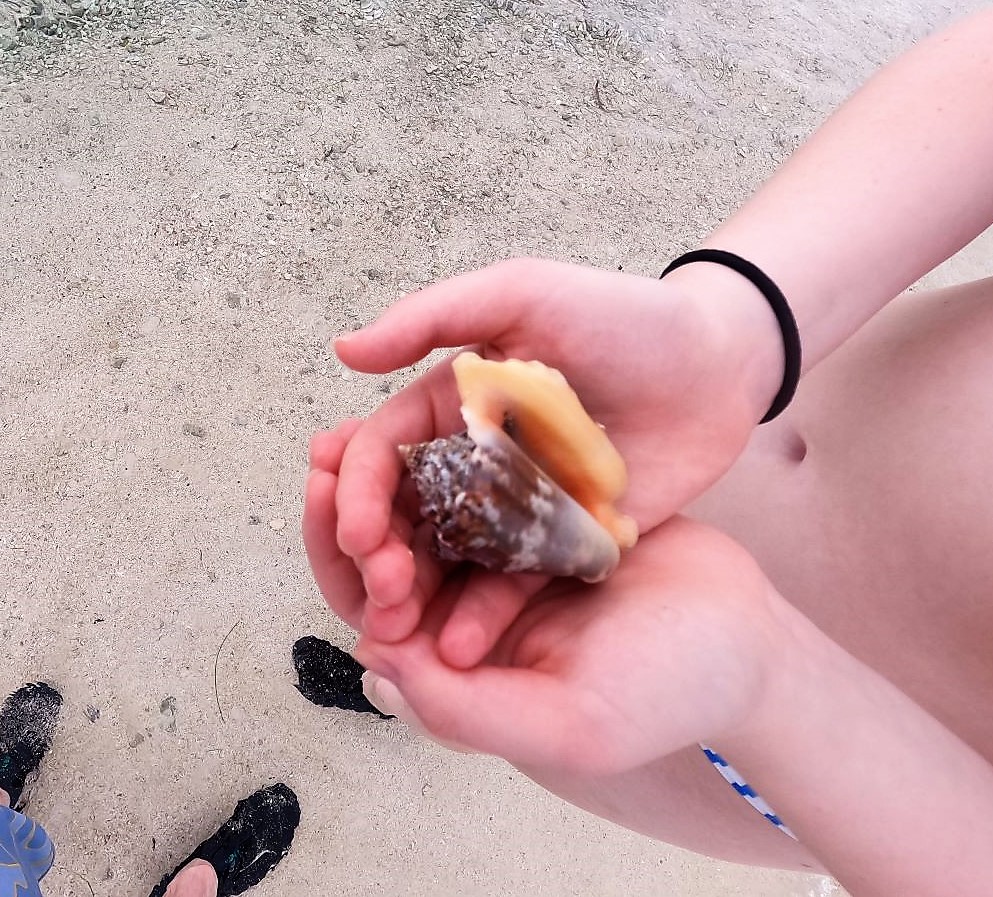 These small rays have a painful stinger but are not deadly to humans. Cassie also found a beautiful shell, but there was a crab inside, so we left it in the shallow water.