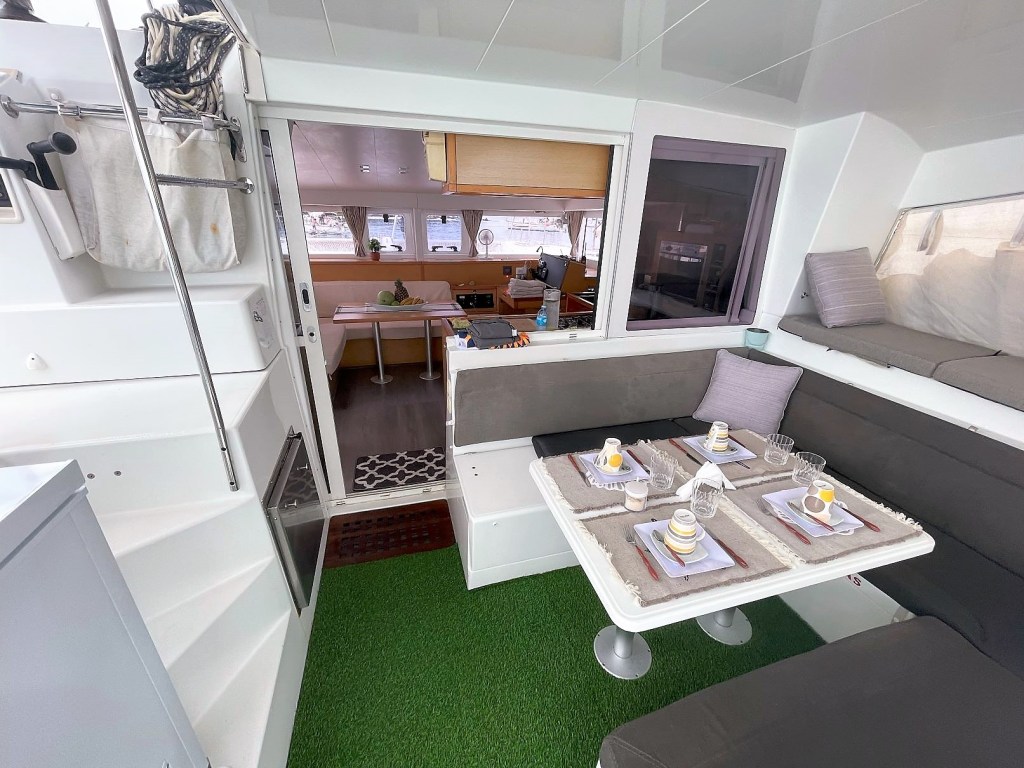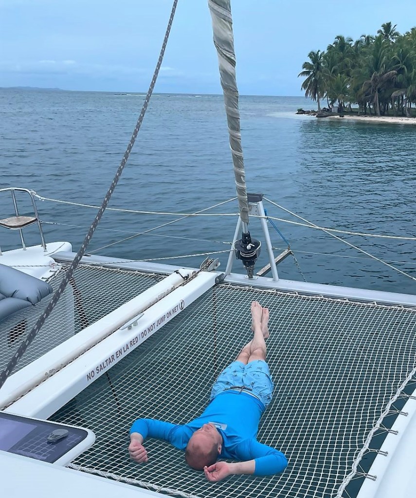 After our swim, we got cleaned up for dinner. I showered on the back of the boat in my bathing suit, which was perfect. As I waited for the girls to finish getting ready, I relaxed on the netting between the twin hulls.