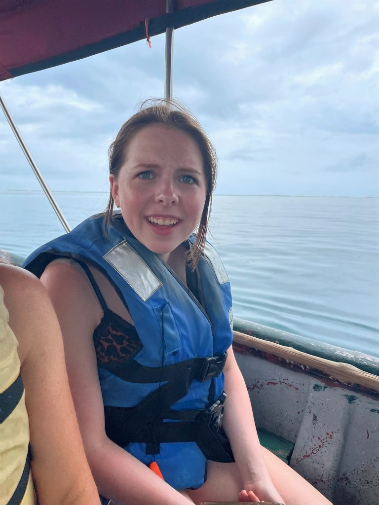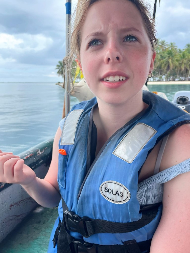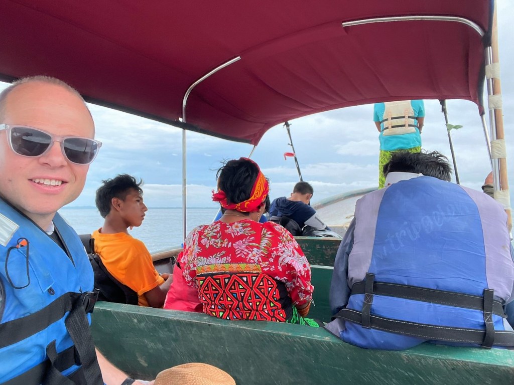 As we were gassing up, a group of locals hopped in the boat. Naturally, they were not offered life jackets, even the elderly woman sitting in front of me, who was dressed in traditional Guna garb. You can also see one person standing on the front of the boat as we travelled, holding onto a strap. He helped to steer the boat by spotting any detritus floating in the water, calling out warnings to the pilot steering from the back of the boat.
