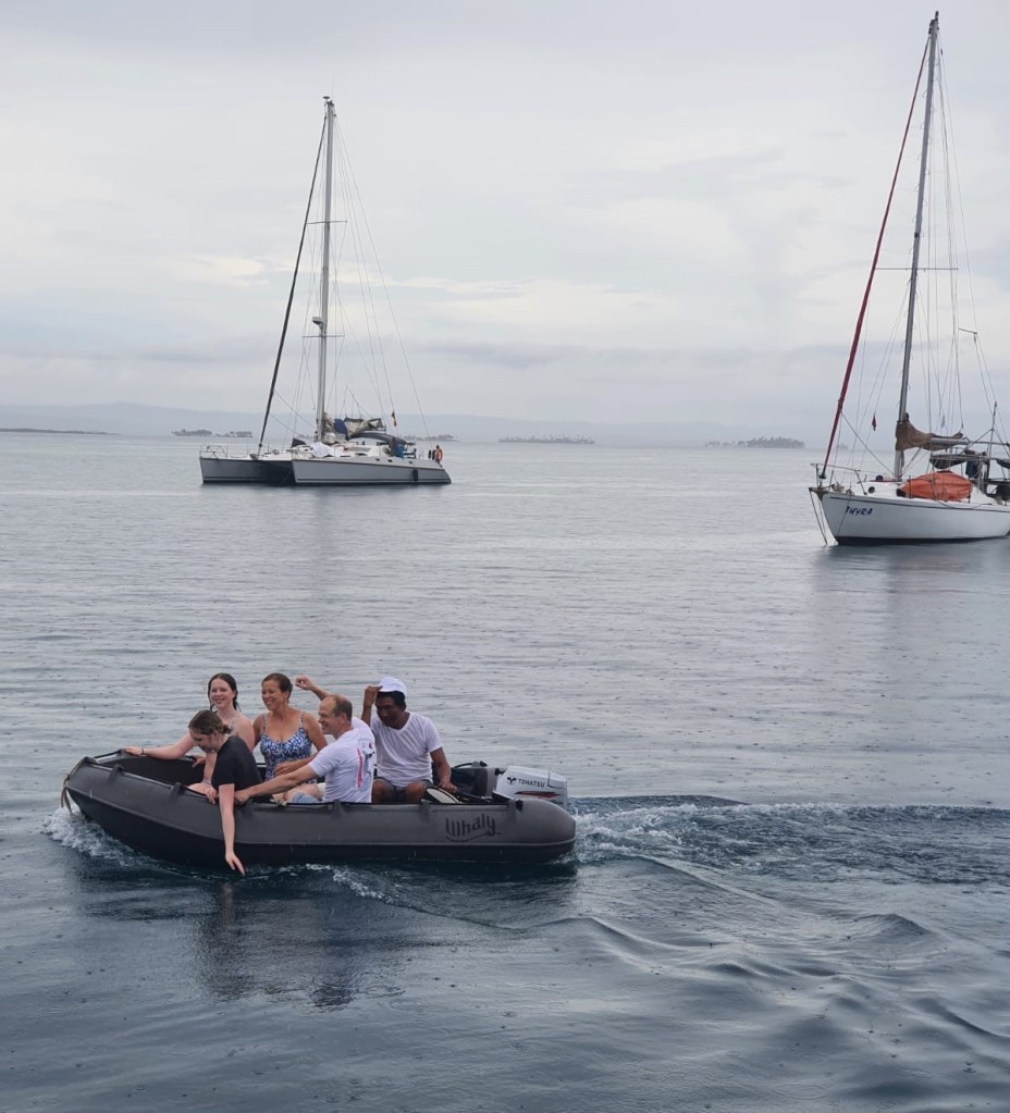 As we traveled the water turned bluer, and we started spotting small islands with palm trees. Between two islands we saw a few anchored sailboats, including our catamaran. As we slowed, Cassie asked, “Why are we stopping at a boat?” I answered, “This is our hotel.” These were the looks we got.