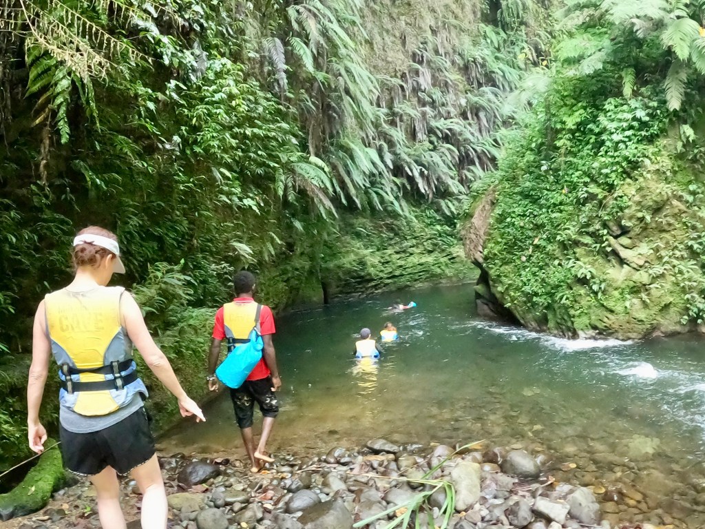 The tour would start with 1.5-hour drive inland to Nambel Village. Along the way we would pass by the Millennium Cave School, a primary school supported in part by the proceeds from the tour. From Nambel, we would hike 30 minutes to Funaspef, another village. We would then hike 2 hours to reach the cave and then another 30 minutes to pass through the cave and out the other side. To be honest, this was the first we’d heard about hiking all the way through cave. I thought the hike would go to the cave, poke around a bit, and then return. I also didn’t know about the next part — about an hour and a half of swimming and canyoning. Then, it would be another hour back to Nambel, and another couple of hours back to Turtlebay. It was going to be a full day!