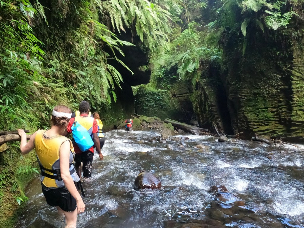 When the stream became too shallow to swim, we scrambled along the rocks to the side, doing our best to find our footing in the rapidly flowing water.