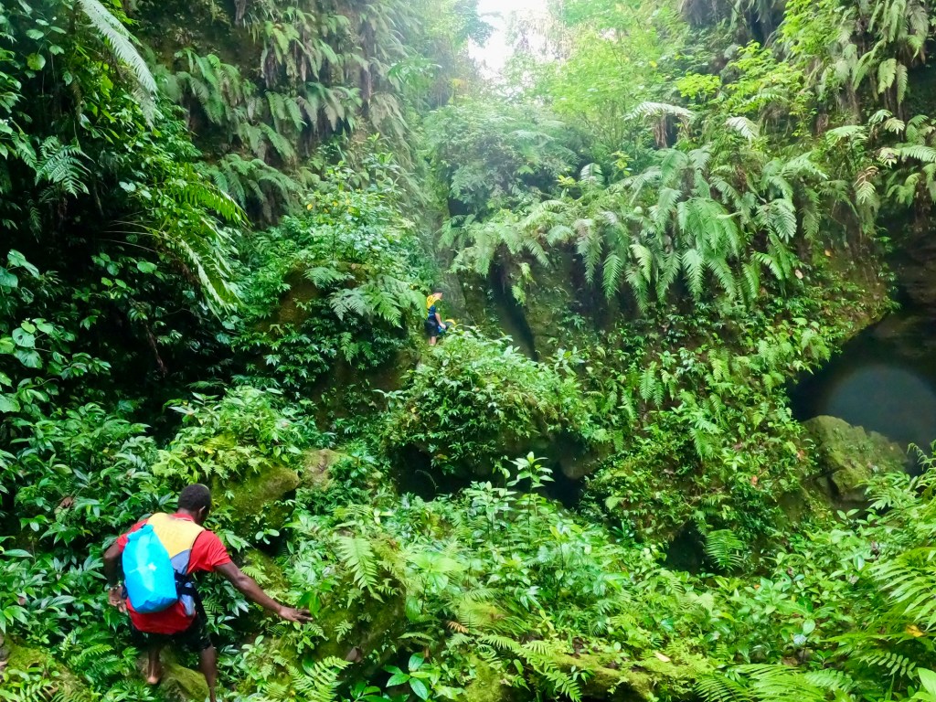 As you can see, we were being extra cautious. There was little margin for error here. If anything went wrong, it would be hard to get any help. We were hours away from Luganville, which was hours and a flight away from Vila, which was hours and even more flights away from any major city. So, a little caution was in order. But we didn’t feel unsafe at any point on our adventure. Our guides were wonderful help, pointing out handholds and safe spots to step, holding Julie’s hand in tougher sections, and frequently checking in with me to make sure I didn’t need more help.