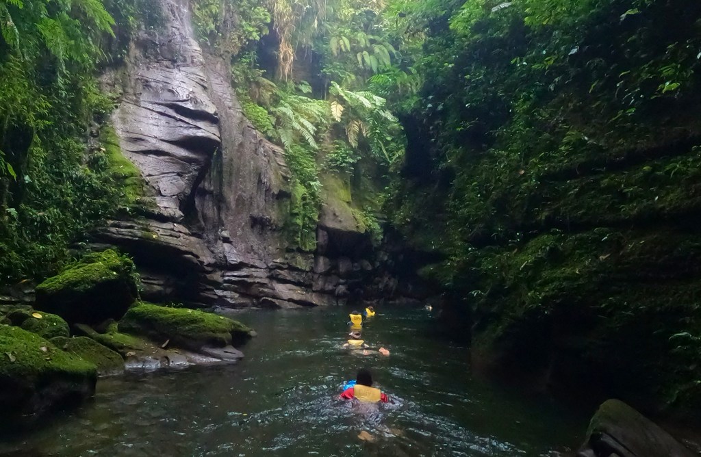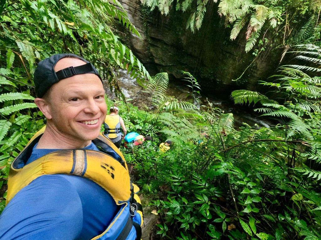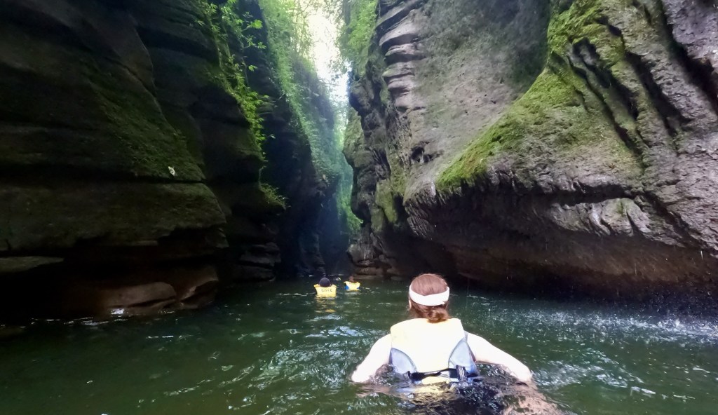 Around this time, Julie and I reached a new stretch of the river, where it wound through a deep ravine, requiring us to swim.