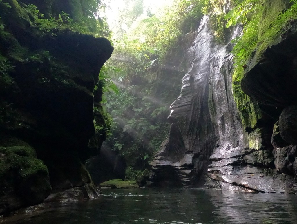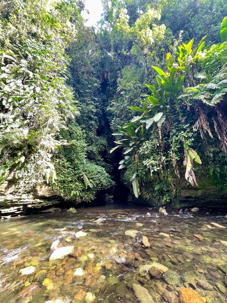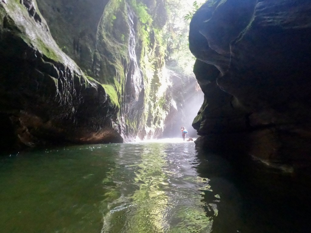 Eventually, we started seeing light in the distance. As we reached the downstream exit, the cave narrowed, and the water deepened, so that we had to swim out of the cave. Julie was not enthused to be swimming in the cave-bird effluent. She *might* have climbed on my back for most of the swim, stopping only when my feet couldn’t touch and she started forcing my head under the water. Around 2pm, we emerged from the cave, where our stream joined with a larger waterway. We climbed onto the far bank feeling exhilarated and looked back towards the cave exit.