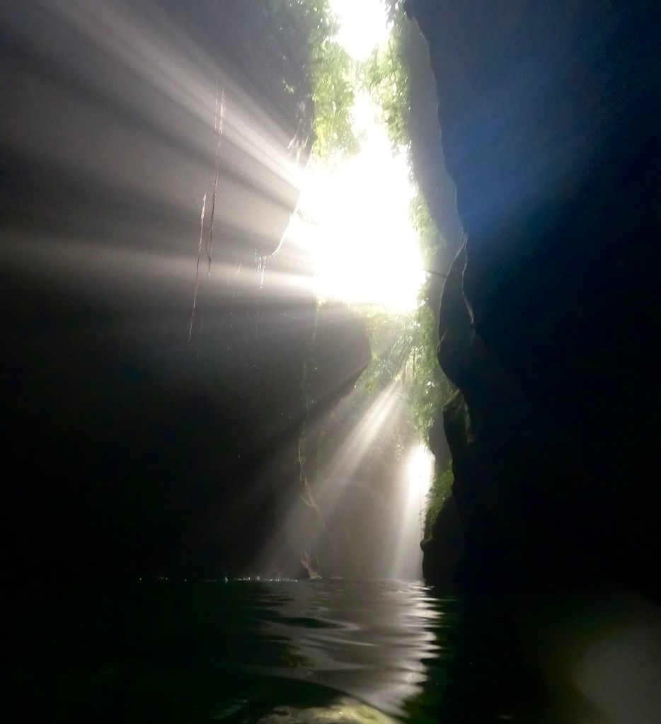 We floated along in this other-worldly place, swimming forward and then turning around backwards to see the stone walls from other angles, with the sunlight catching the moist air.