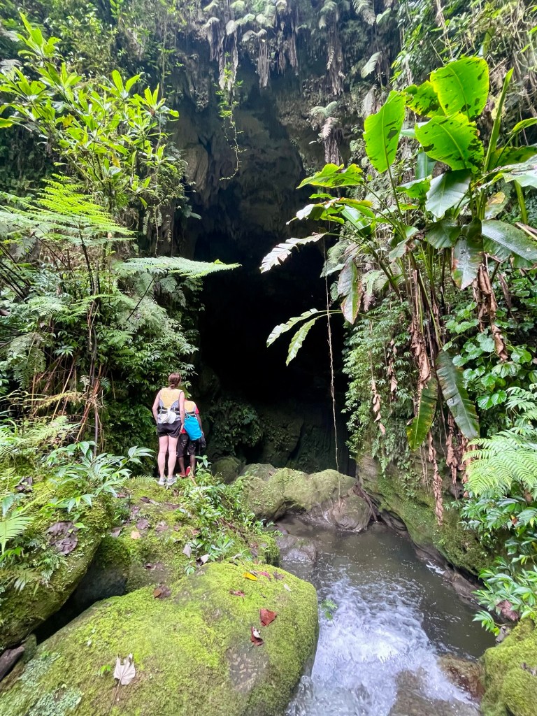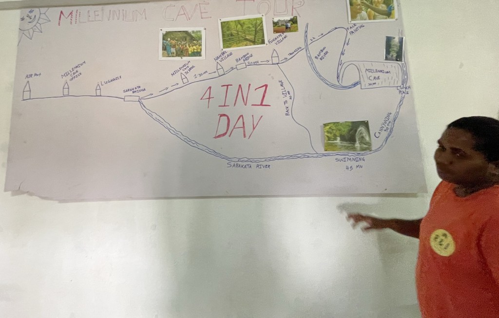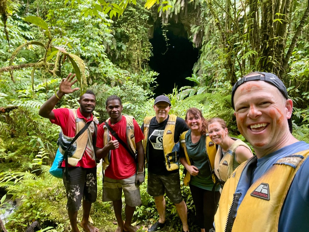 The day for Julie and me started fairly early. We headed down to the reception area of Turtlebay to pick up the picnic lunches we’d ordered the night before. We also got a couple of dry bags for our food and sundries. Around 7:30, we were picked up by Michele, the kind man who runs the tours. We chatted with Michele as we drove us to pick up another couple, a husband a wife from Tasmania — Jason and Sharyn Stone. The drive took about 30 minutes, despite Michele taking a short cut using an overgrown dirt road made by the Navy Seabees during WWII. Michele explained to us that the tour is something of a family business. The cave was largely explored by Michele’s father, and the tour was founded by Michele’s brother, who unfortunately passed away in 2023. The tour launched in the late 1990s, and Michele’s brother renamed the cave “Millennium” in the hopes of capitalizing on some of the excitement around the pending change from the 1900s to the 2000s.