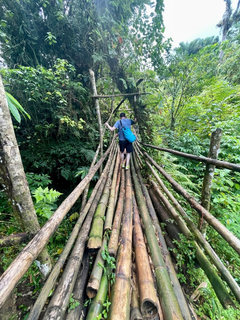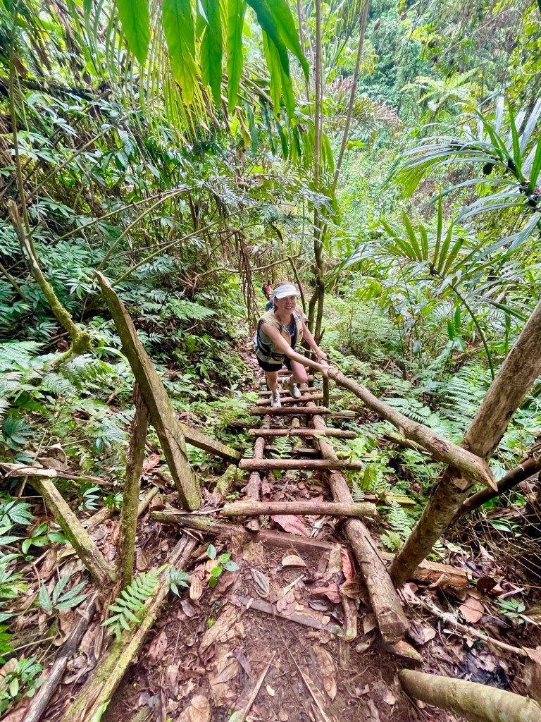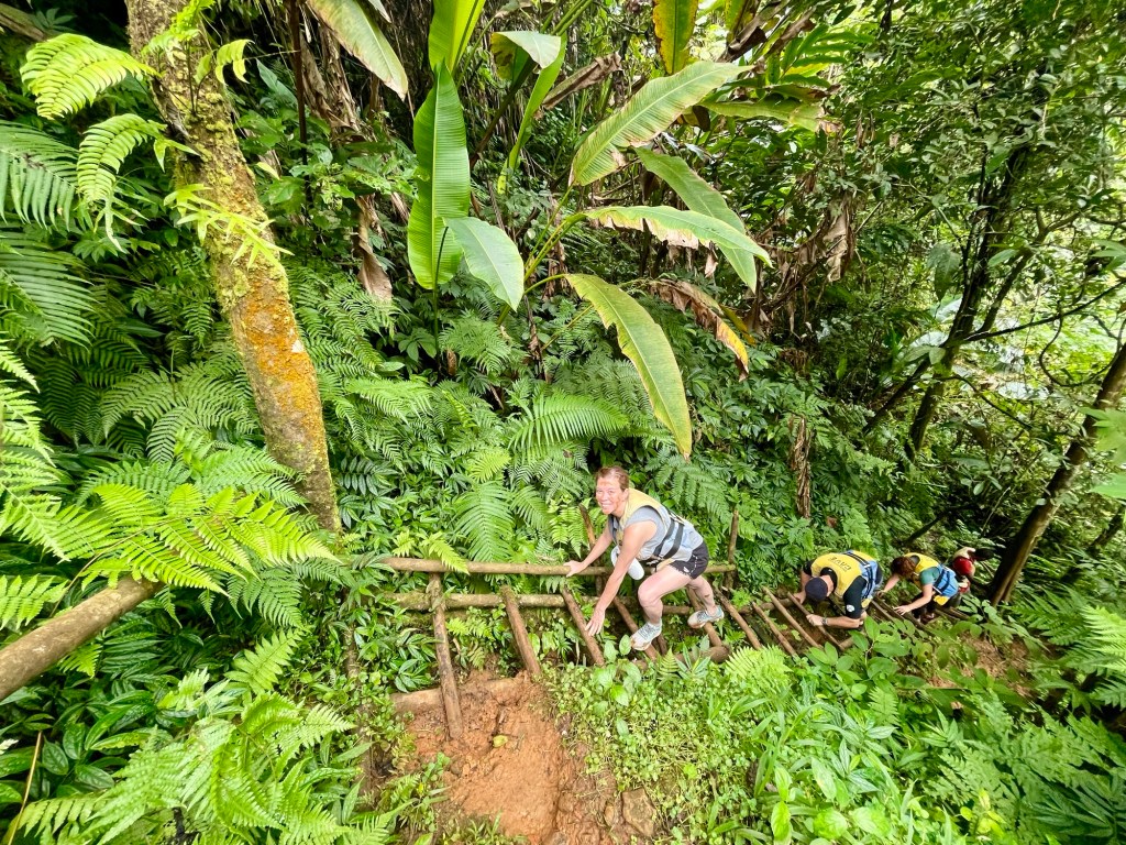 It was actually easier to go down the ladders backwards, which is why Julie is facing me as she climbed down. There were rough railings in some spots, but in other areas the railings were either rotten or otherwise absent. In those stretches, we had to use our hands on rungs, which is why going backwards was easier and safer. But it wasn’t all down. We went up and down as the trail snaked through the jungle (where there are no venomous snakes fortunately).