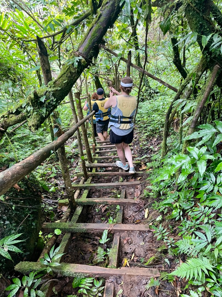 As we hiked, huge ferns lined the trail. Clearly, this place sees a lot of rain from time to time. With some dark clouds in the distance, we kept our fingers crossed that the rain would hold off for our day in the jungle, particularly the part where we would be underground.