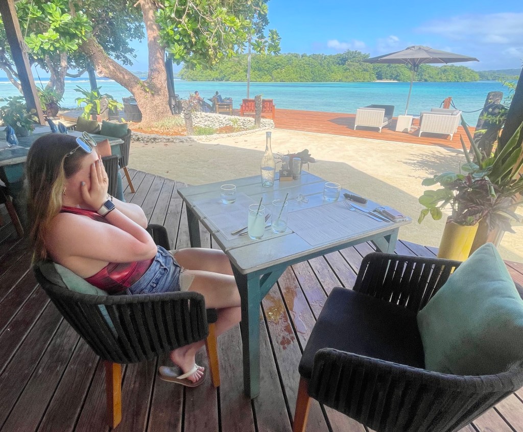 We got back in the truck and drove the muddy, steep, twisting road back to Luganville and then dropped off the Stones. As we headed towards the Turtlebay, we chatted with Michele, who played some local music for us and told us about his life. He dropped us off around 6:30 pm, but before he left, we made a donation to the school that the Millennium Cave Tour supports. We’d budgeted our trip for four people to go on the excursion, so we had a little extra to give. It wasn’t much, but Michele wasn’t expecting it. In response, he hugged us. We hugged him back.