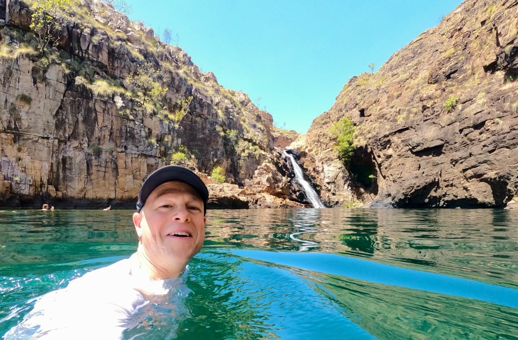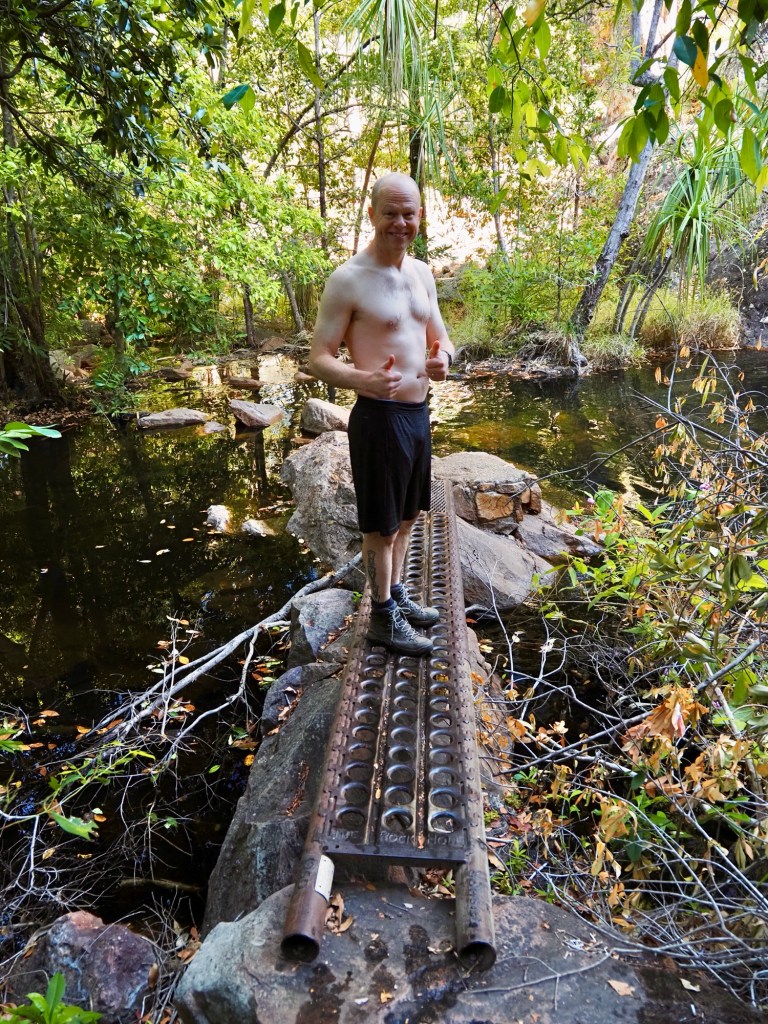 We then turned off the paved road onto a rough dirt track headed back into the bush. Glenn informed us that we were headed to a small swimming hole. We parked and after a short walk reached an adorable little pool surrounded by small, rocky cliffs. Glenn assured us that it was safe to swim here, as the Salties (dangerous) don’t come this far inland particularly “in the dry,” and the Freshies (*allegedly* not dangerous) probably don’t come here and are nothing to worry about in any case. To prove his point, Glenn stripped down to his itsy-bitsy teeny-weeny black speedo and hopped in the water. Despite his endorsement, Julie declined, but I couldn’t resist. It was time for this pale American to immerse himself in the Outback.