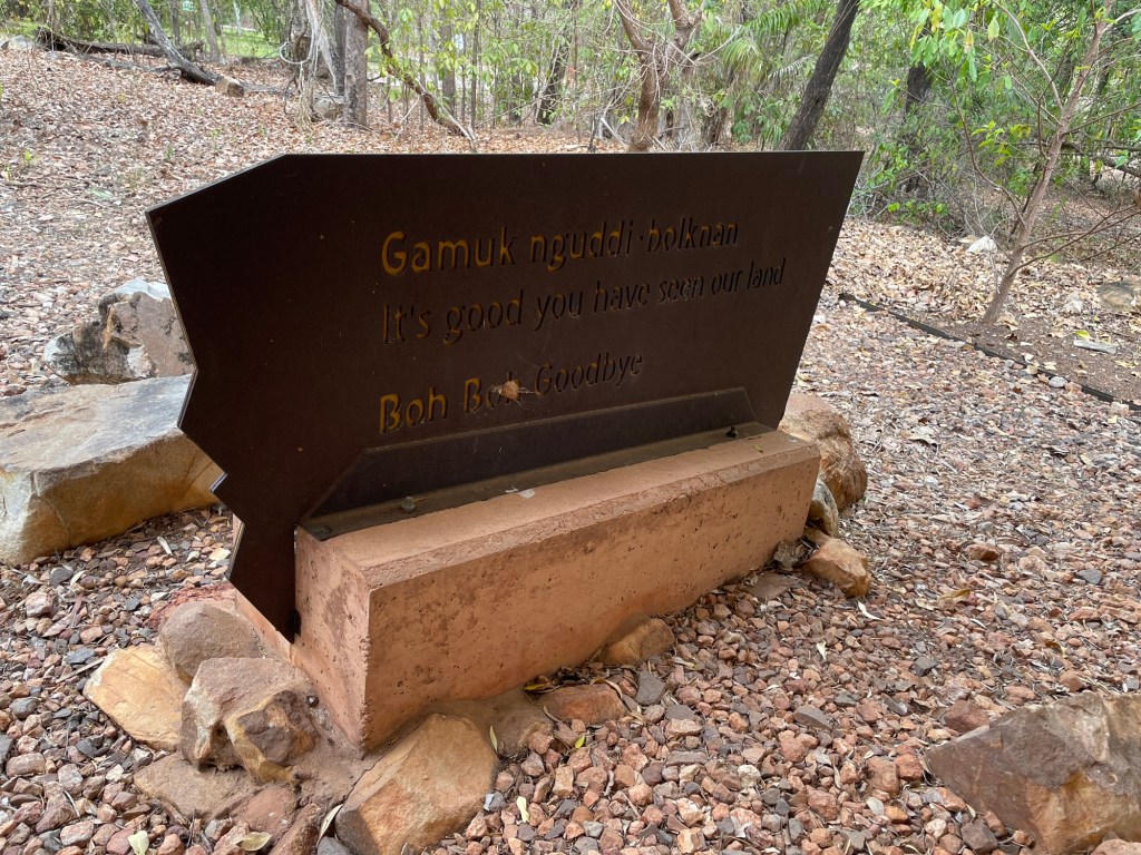 After the swim in the gorge, we drove to a nearby lodge for a late lunch and a very tasty beer. From here, Julie and I checked out the Warradjan Cultural Center, which told us more about the local aboriginal people. Photography was prohibited in the center, so we don’t have any pics, but we were allowed to take one of the sign as we left. It said, “Boh boh,” which was translated as “Goodbye.” Glenn had described this word differently on our tour, likening it to “see you later,” as the finality of “goodbye” didn’t sit well with the aborigines.