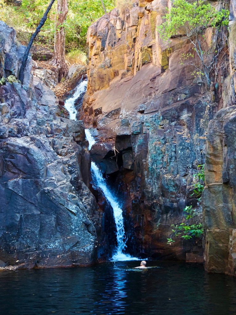 Once there, I used my now finely honed croc-detecting skills to assess the situation. (I saw there were already people in the water including some morsel-sized children. No screams = safe enough to swim). Julie decided to wade to her knees, while I jumped in the water and started swimming for the waterfall at the far end of the gorge.
