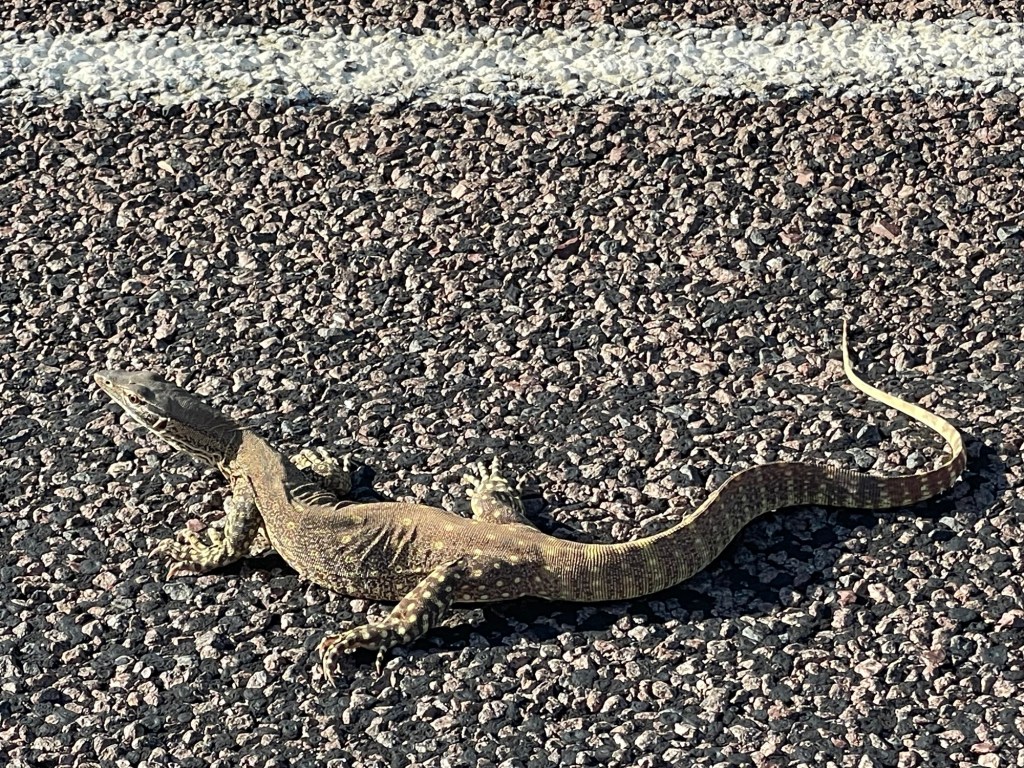 The next morning, we packed up to leave Kakadu. As we left the park, we spotted a good-sized monitor lizard, known locally as a sand goanna.